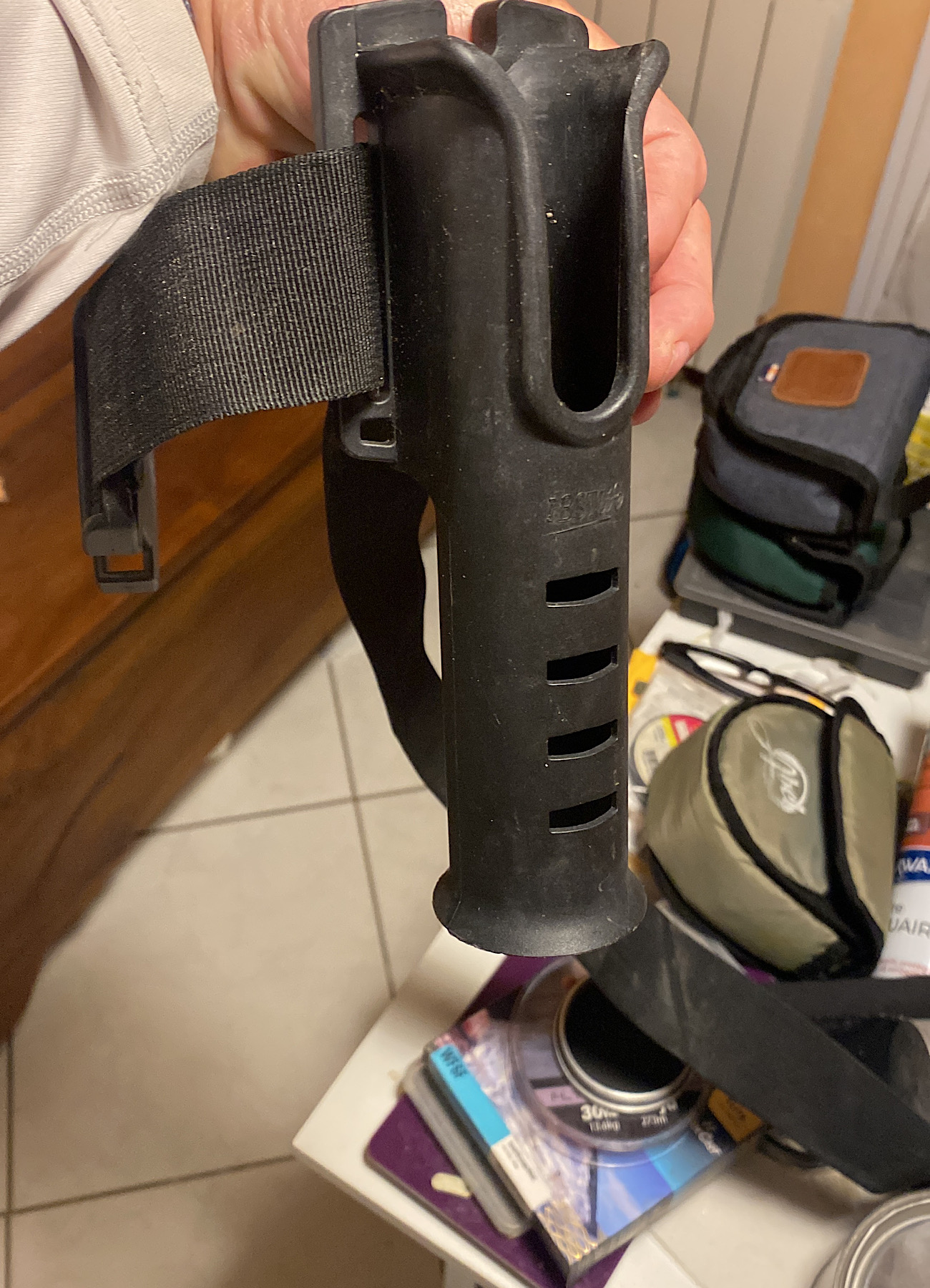 Il me semble que Stéphan veut le porte canne pour la canne avec laquelle il pêche pas une deuxième, c’est pour ça que celui que je vais lui passer devrait convenir, il tient bien canne
