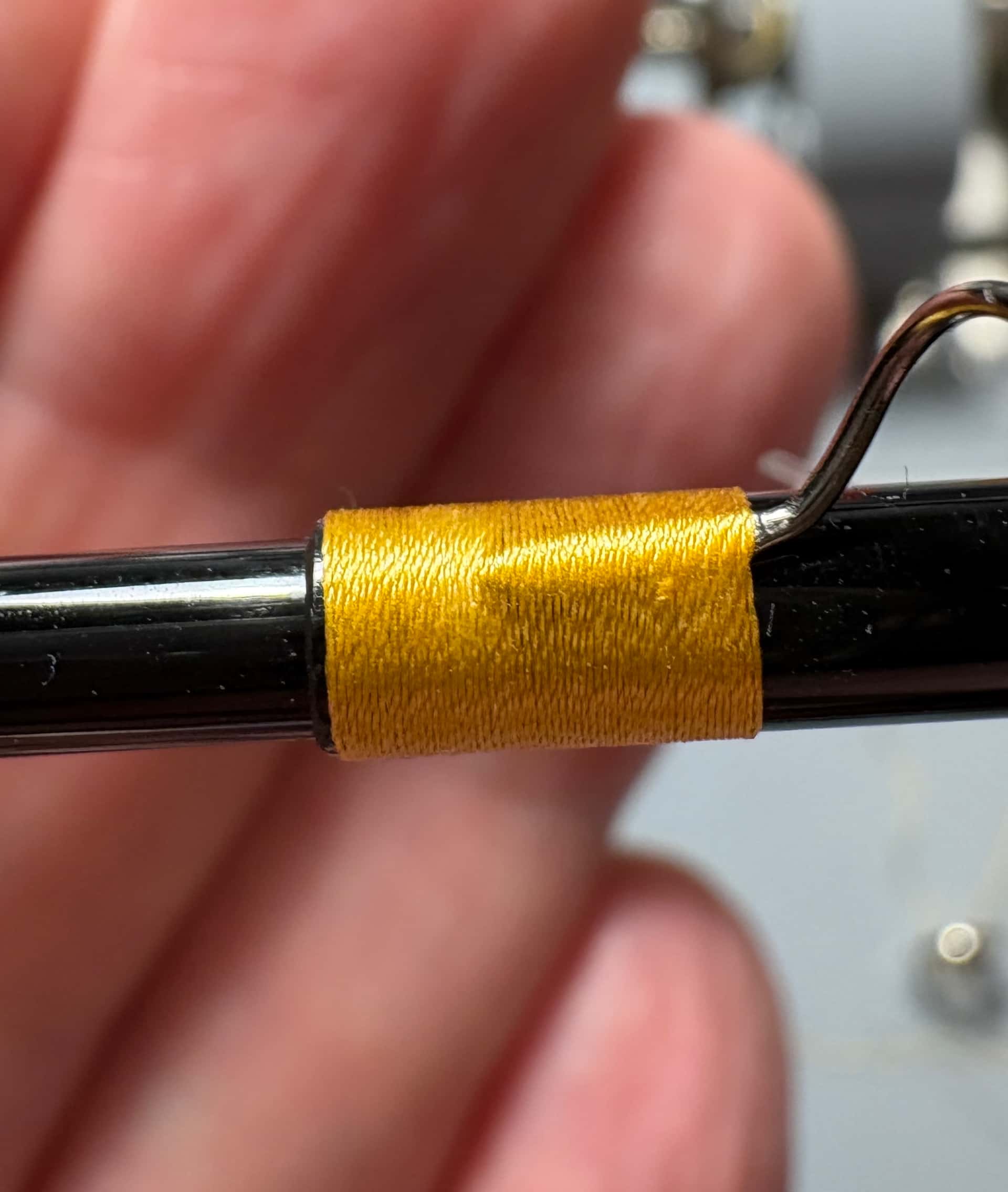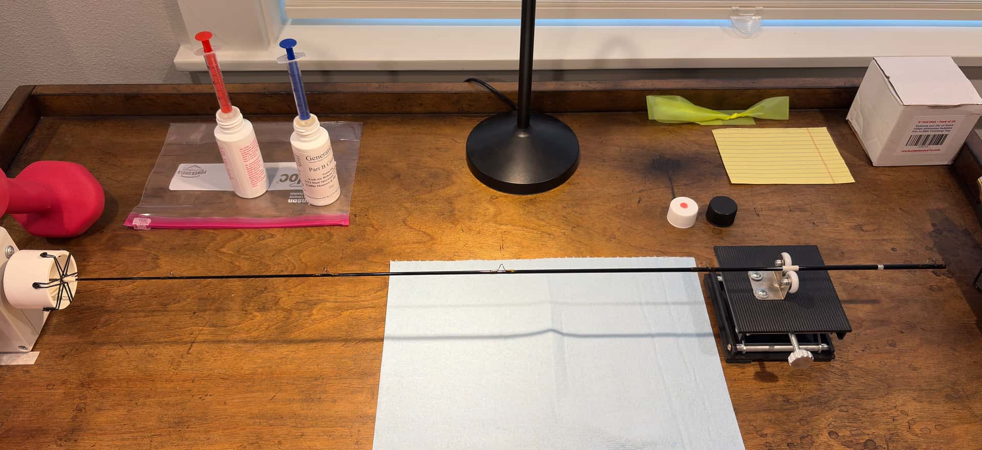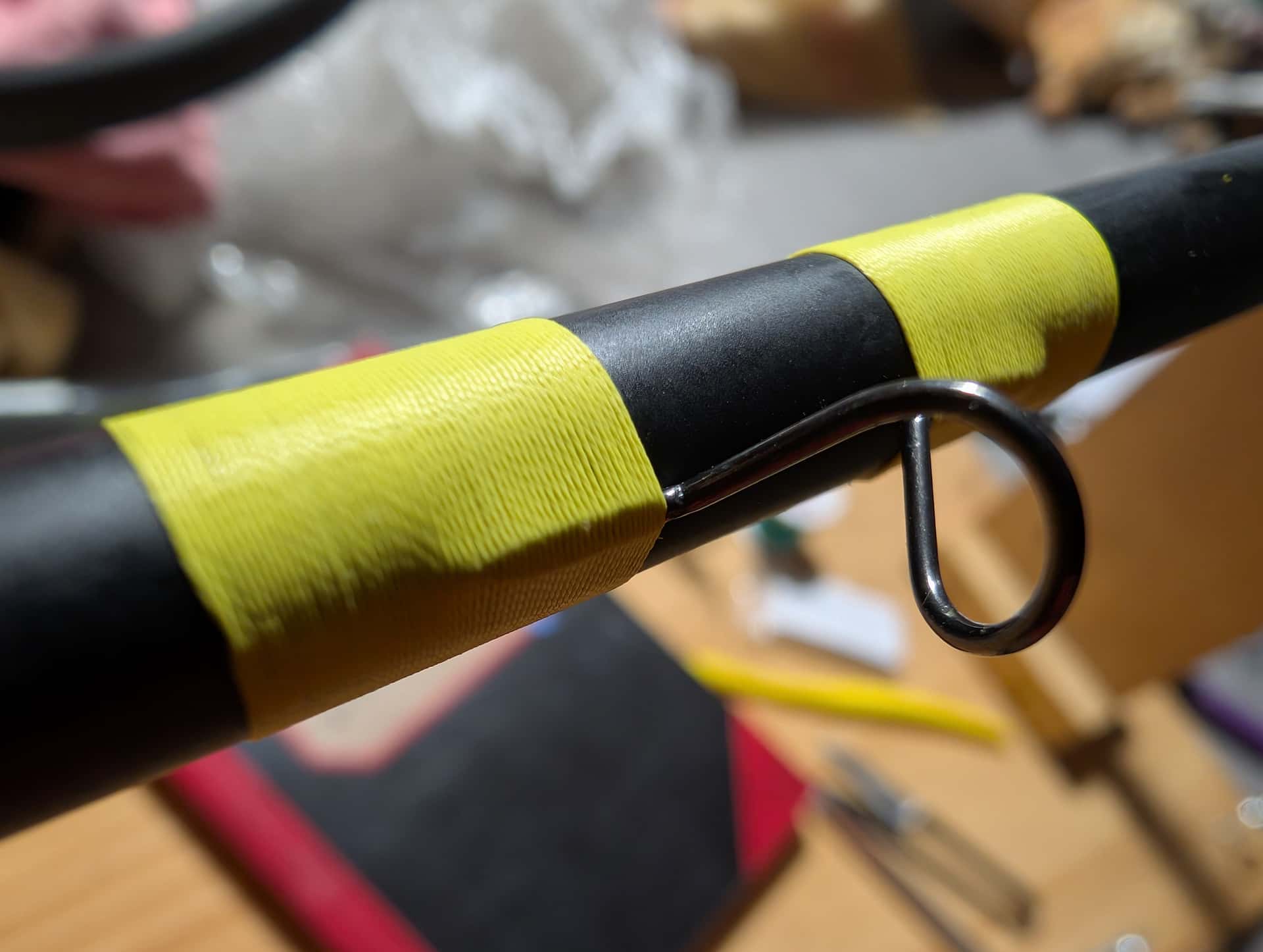 Je l’ai découpé à la dimension souhaitée, puis je l’ai collée sur le porte moulinet. Ensuite, une couche de vernis uv, puis plusieurs couches de vernis classique.
