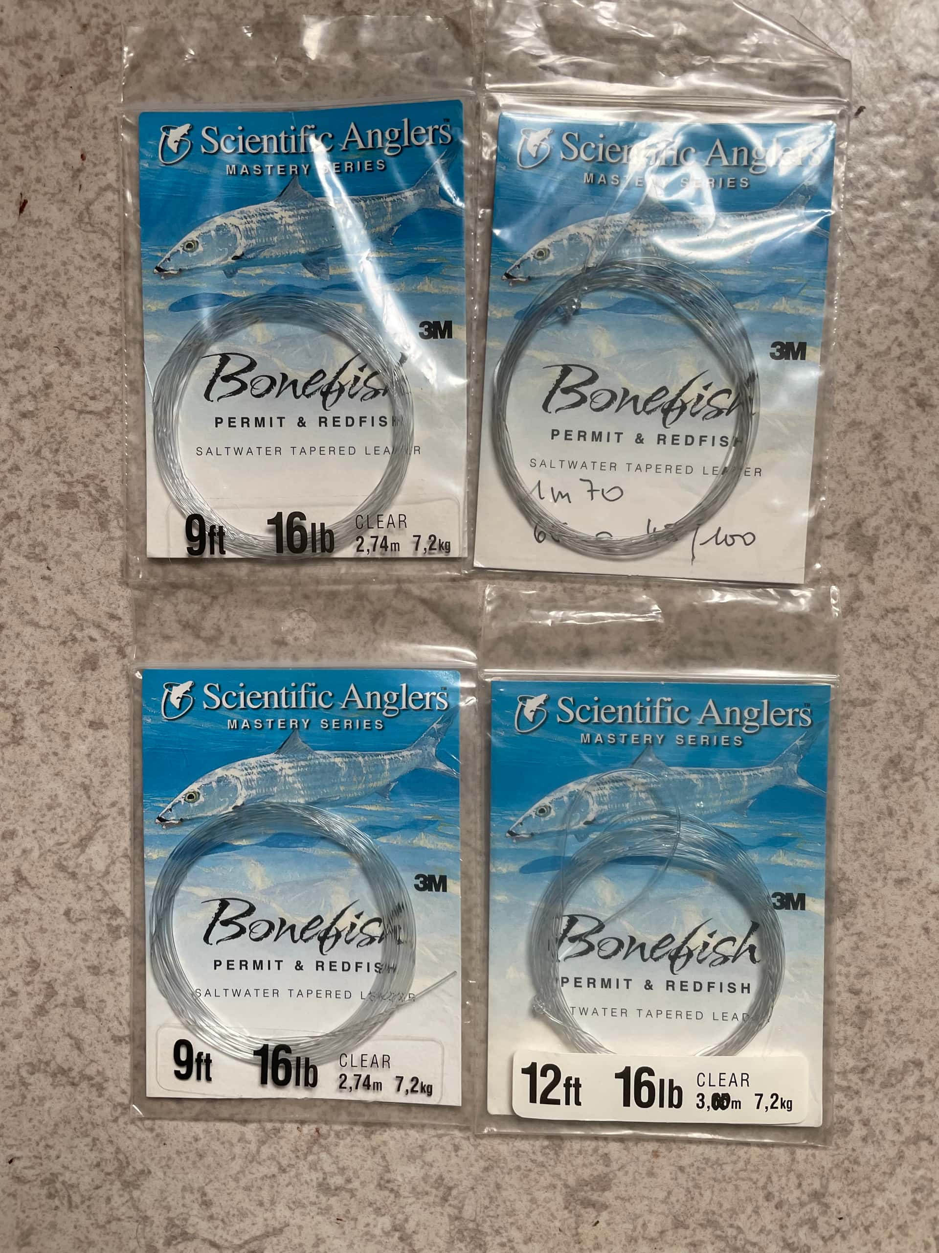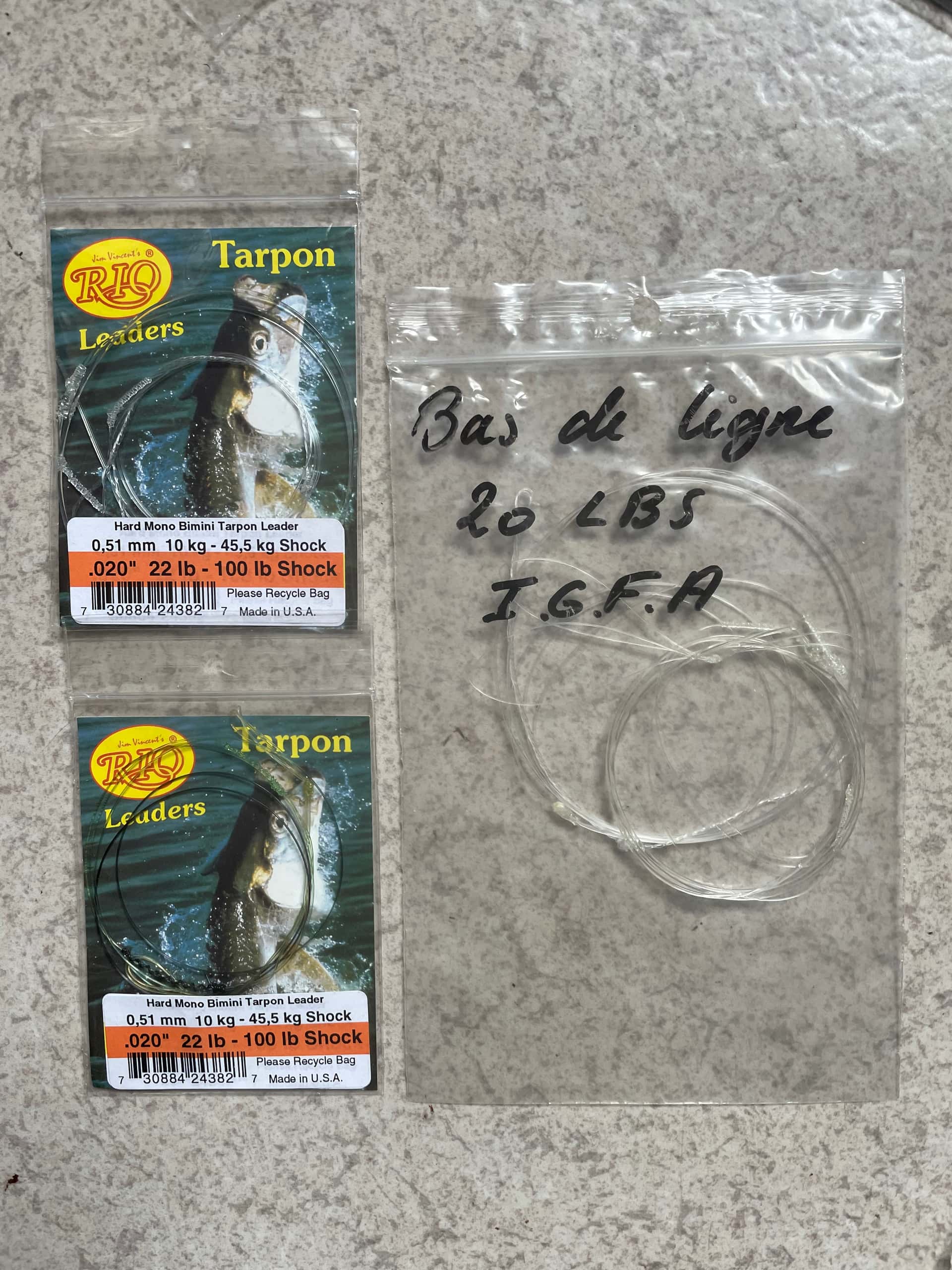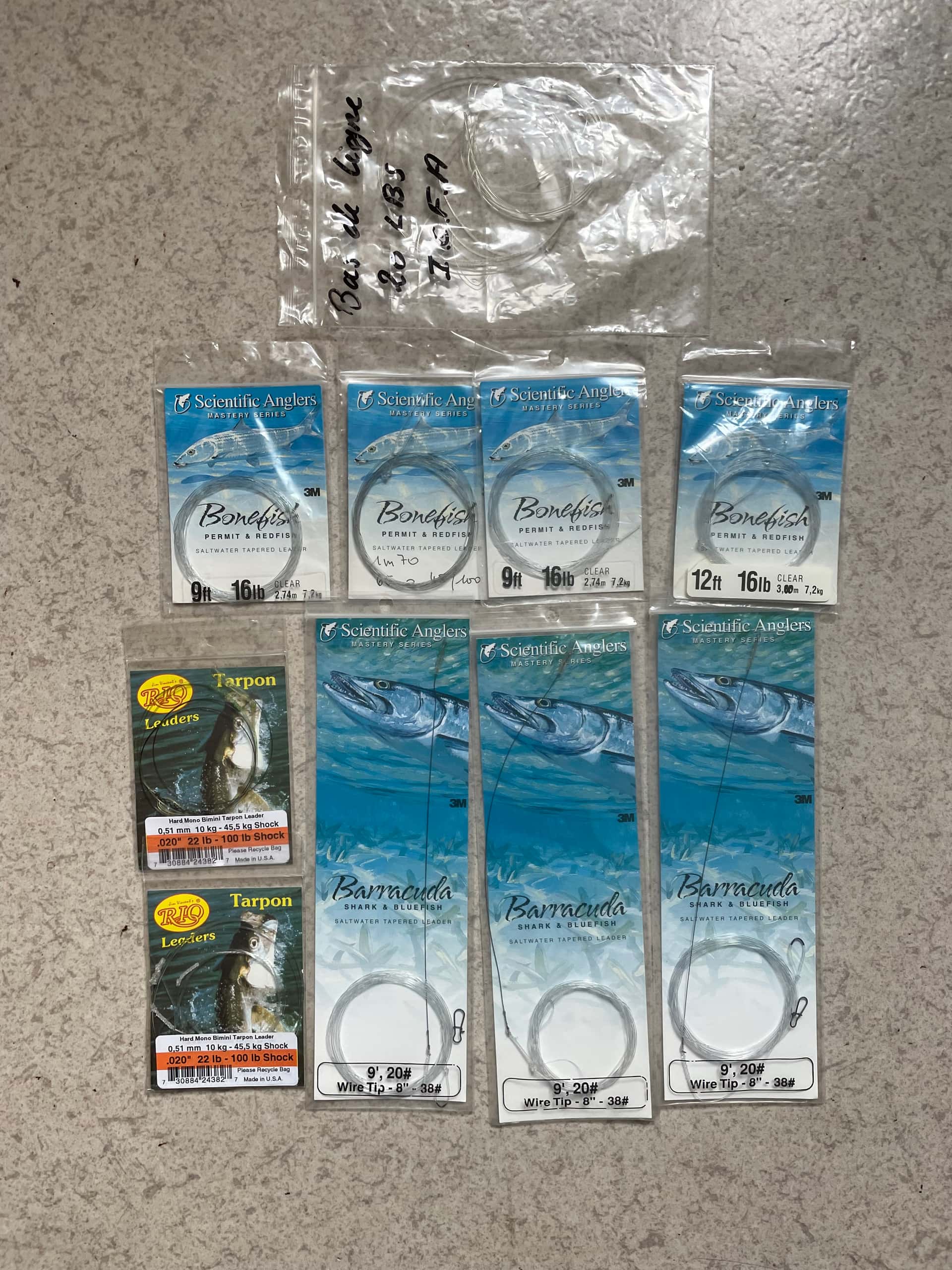 Bonjour , je vends 10 bas de lignes . 4 bonefish 2,74m 7.2kg 3 barracuda 9’,20# wire tip -8’'-38# 2 tarpon 0.51mm 10kg 45,5 kg shock 1 20 livres IGFA 50 euros port compris