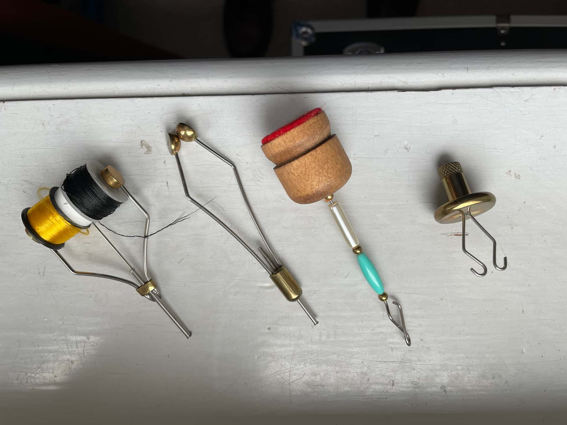 Bonjour , je me sépare de petit matériel 1 écran de montage à 2 couleurs de face 1 ensemble MAGIC Tool de Marc Petitjean 5 pinces et notice 1 whip finisher De Charette 2 twister 2 porte bobine dont un double 30 euros port compris